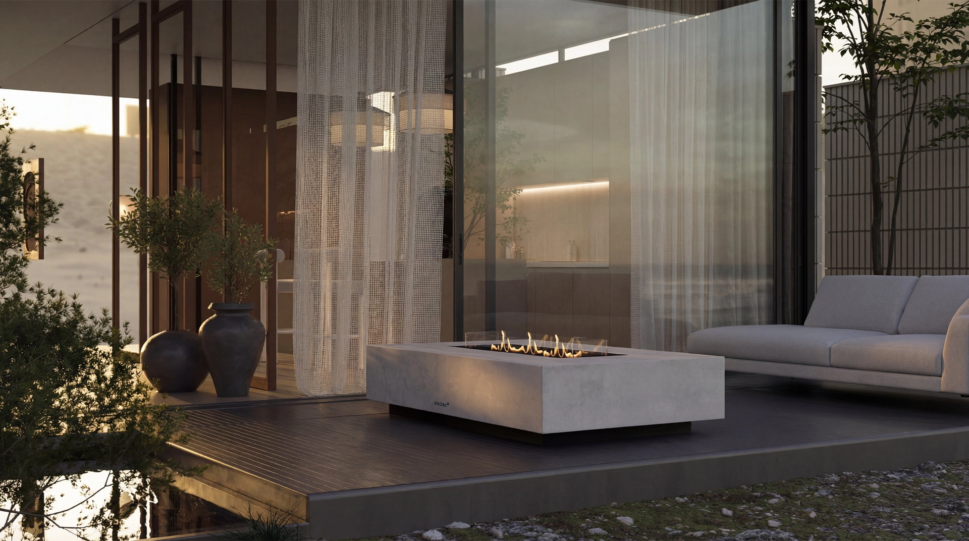 As lareiras a bioetanol da Out Collection da Shelter combinam design contemporâneo com sustentabilidade, oferecendo soluções elegantes para espaços exteriores. Estas lareiras proporcionam uma chama real, limpa, sem fumo, cinza ou odores, graças à utilização de bioetanol como combustível. Além disso, apresentam a avançada Tecnologia BEV™, que transforma o bioetanol em vapor antes da combustão, garantindo um funcionamento seguro e eficiente.
