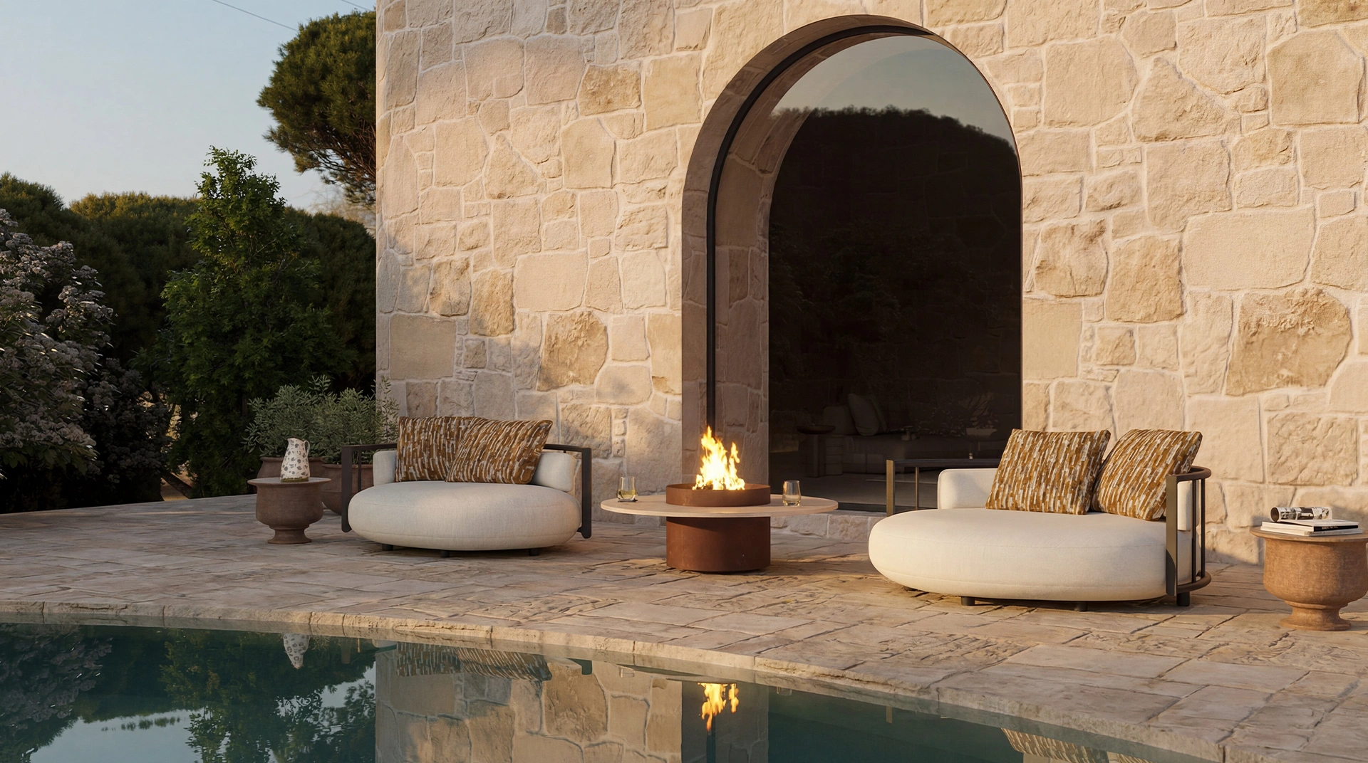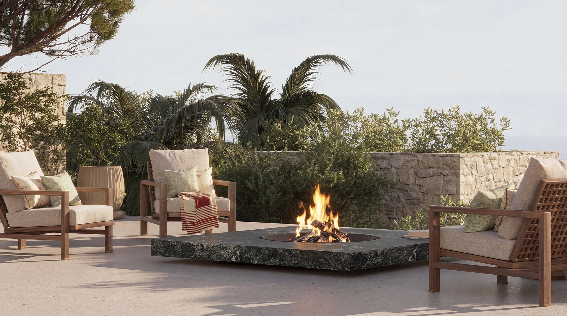 Plate é uma lareira de exterior concebida para espaços onde a presença do fogo deve ser equilibrada e discreta. Disponível nas versões a lenha ou a gás, oferece versatilidade técnica para qualquer projeto arquitetónico.