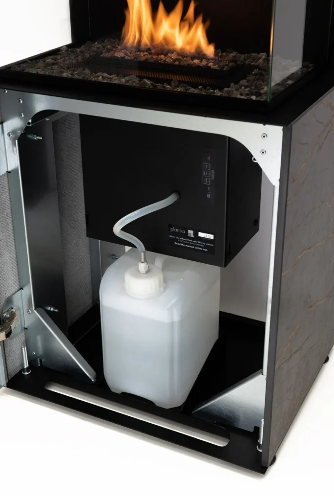 Refuelling has never been so easy. Simply open the door of the lower compartment, remove the empty ethanol fuel cylinder and plug in a new one. The fireplace is extremely economical, as an external processor and fuel quantity sensors monitor the quantities consumed.