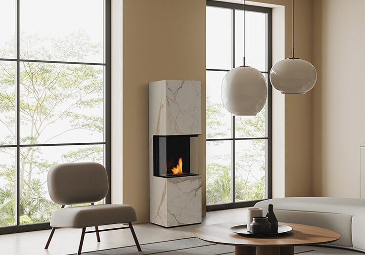 Rock is an automatic ethanol fireplace with innovative BEV technology developed by Planika engineers. This free-standing fireplace is available in three cladding options: Daze, Laurent or KretaDekton. The Rock allows the fire to be arranged in the room without delay. No additional renovation work, no smell, no smoke and no ash.